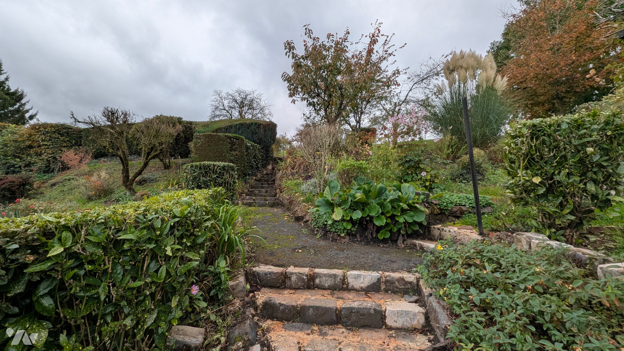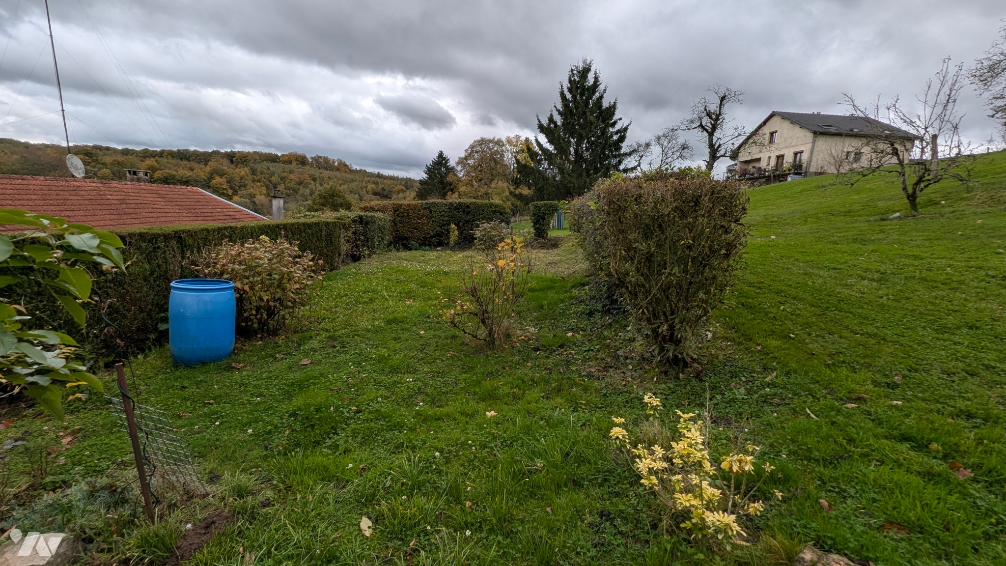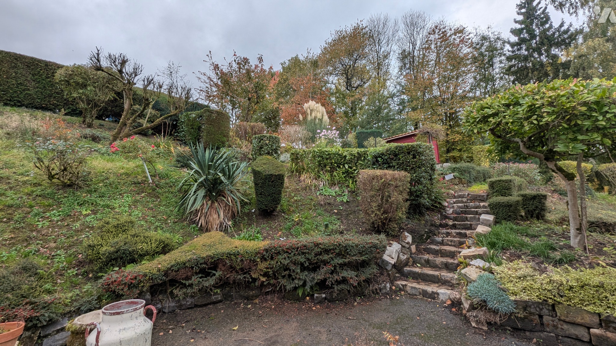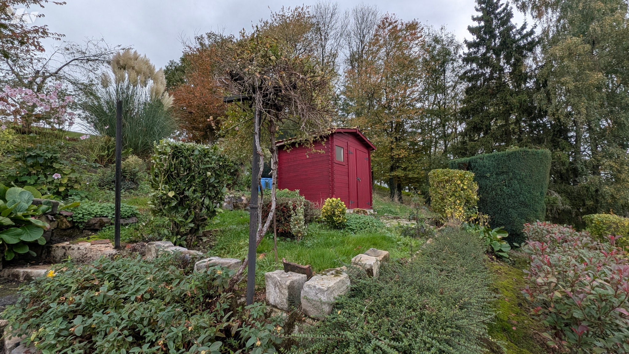 Terrain aménagé et arboré, avec abris de jardin.