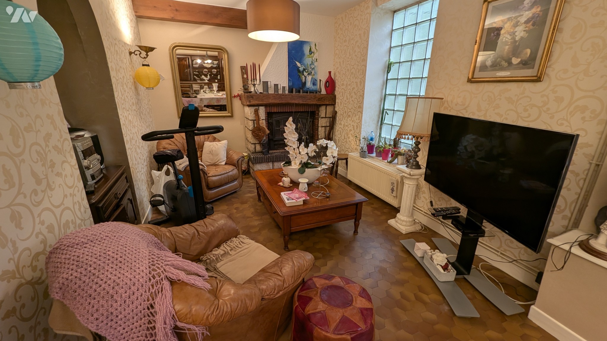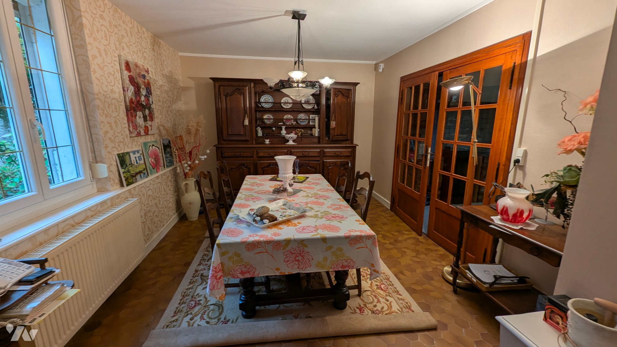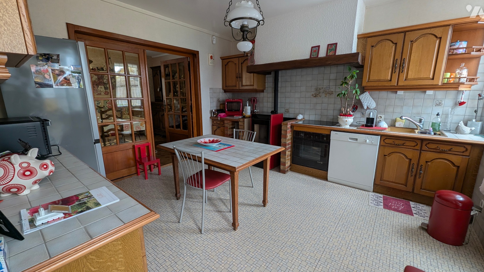 - Au rez-de-chaussée : entrée, cuisine aménagée avec poêle à granulés, salon-salle à manger avec insert à bois, w.c., salle d'eau, buanderie, chaufferie et cellier.